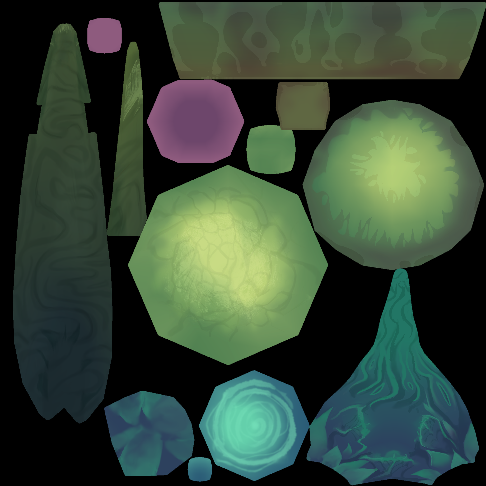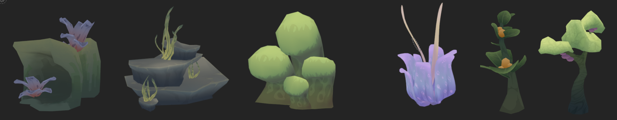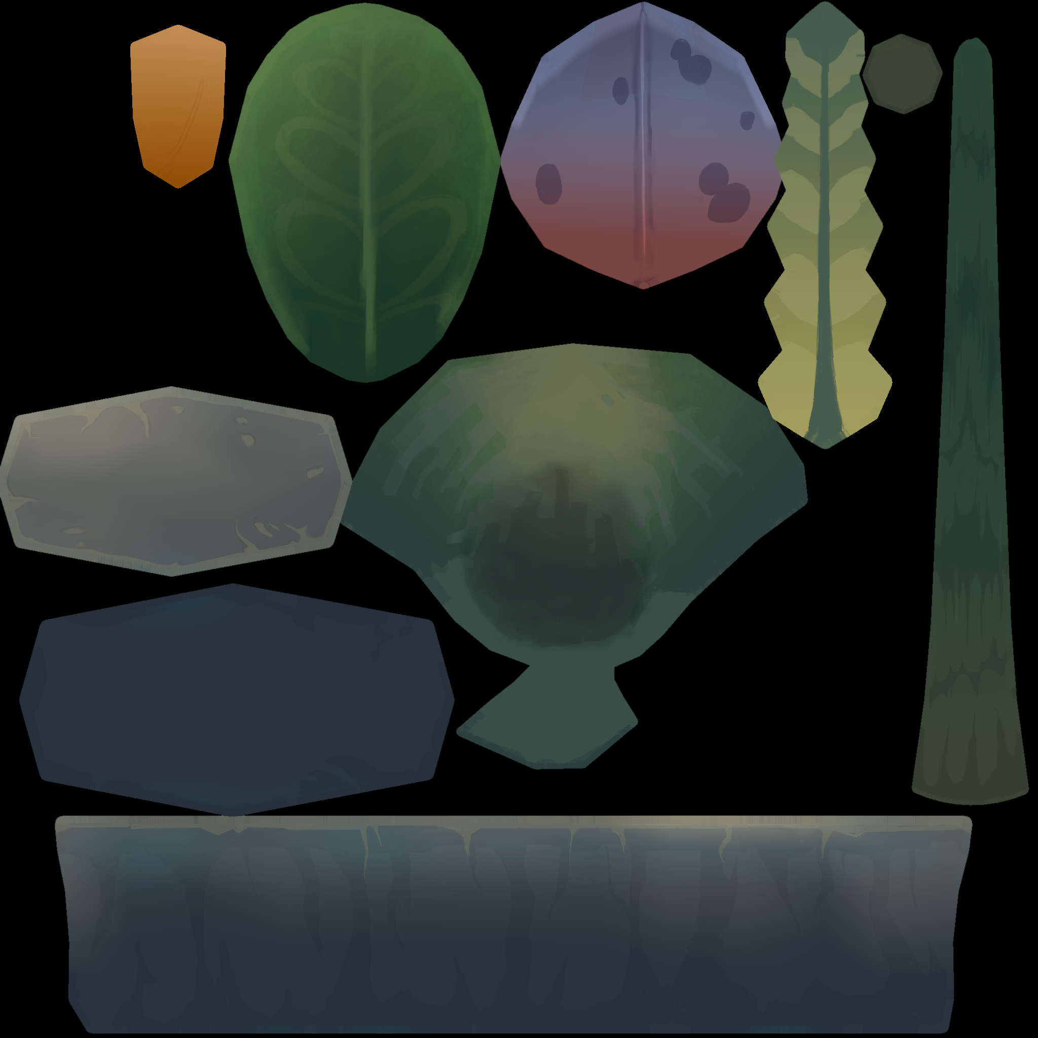 I did the UVs as well for all of the assets, for the environment I optimized them allowing for multiple plants to only use 1 uV tile